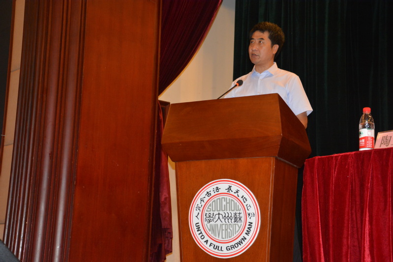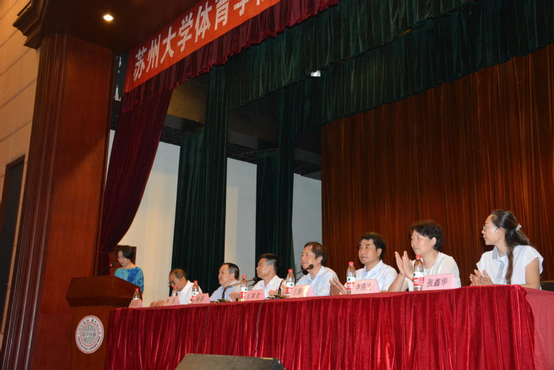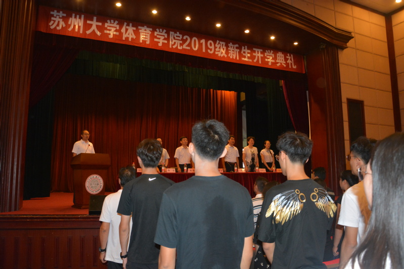 开学典礼在激昂的国歌声里正式拉开序幕。首先,体育学院院长、博士生导师王国祥教授代表学院党政对来自全国十多个省份和直辖市的新同学表示衷心的祝贺和热烈的欢迎。王院长介绍了苏州大学及体育学院的历史概况,展示了体育学院近几年突出的成绩。他告诫同学们在未来的三年里一定要沉下心来,学会“耐得住寂寞、经得住诱惑、守得住清贫”,搞科研要有“板凳宁坐十年冷,文章不写半字空”的学者风范。