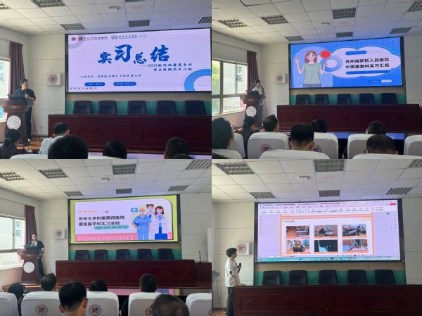 来自四家实习医院的小组代表依次汇报:廖文冉(市立医院北区)阐述闭环评估-干预流程,胡朗(苏大附四院)分享Maitland与Mulligan手法案例,华雨雪(高新区人民医院)展示中西医结合康复模式,叶枫(南大医学院附属苏州医院)系统梳理轮转要点,充分体现了“从知识到能力、从校园到社会”的成长跨越。