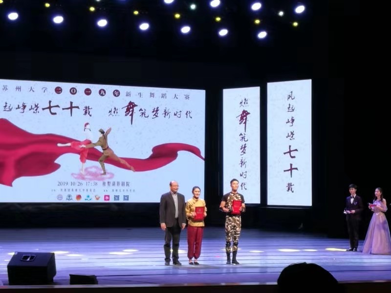 10月26日晚,由共青团苏州大学委员会主办、苏州大学学生会承办的2019年新生舞蹈大赛在独墅湖影剧院隆重举行,大赛以“风起峥嵘七十载,燃舞筑梦新时代”为主题。我院2019级新生所表演的舞蹈《军魂》气势磅礴、内涵深刻,最后从27支参赛队伍中脱颖而出,荣获此次大赛的一等奖。