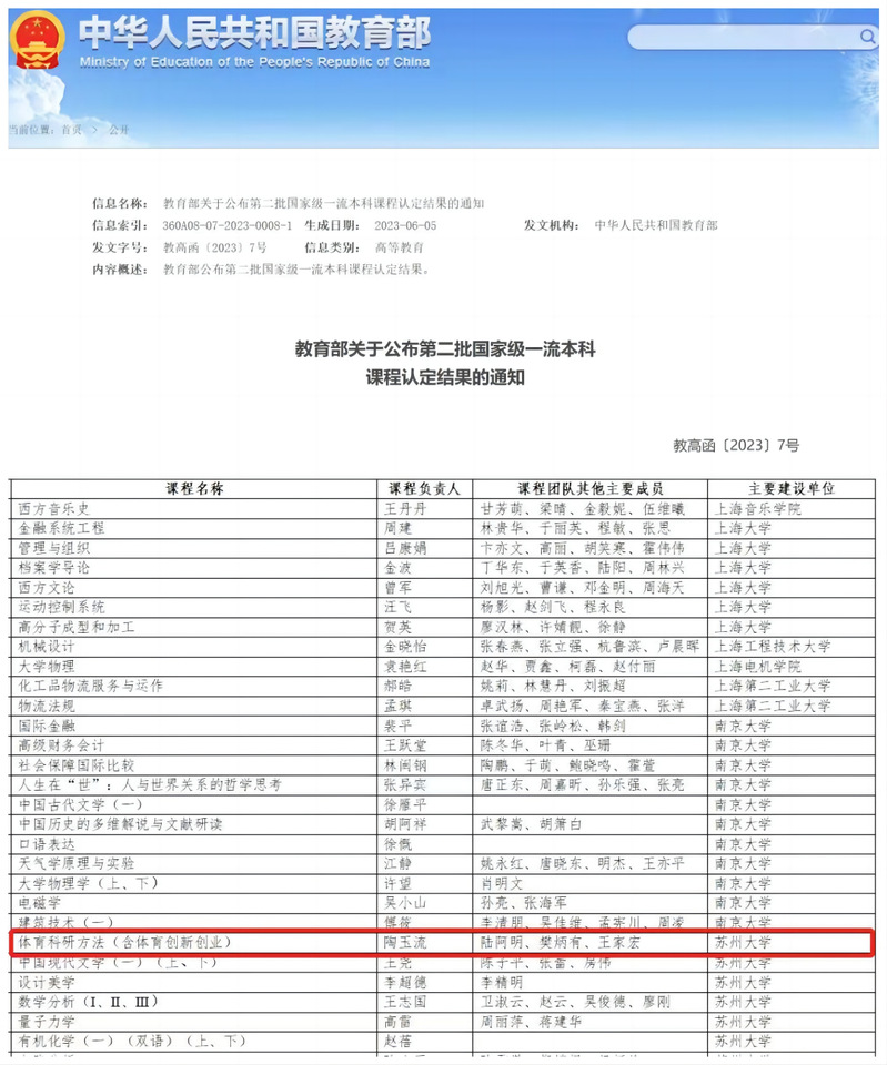 近日,教育部发布了《教育部关于公布第二批国家级一流本科课程认定结果的通知》(教高函〔2023〕7号),我院陶玉流教授及其团队(陆阿明、樊炳有、王家宏)的《体育科研方法(含创新创业)》课程获批国家级线下一流本科课程。