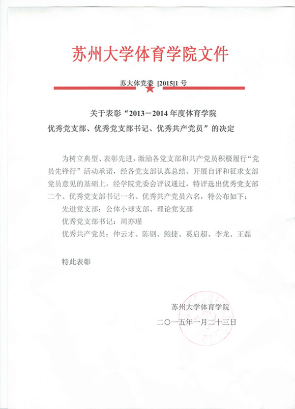 关于表彰“2013-2014年度体育学院优秀党支部、优秀党支部书记、优秀共产党员”的决定