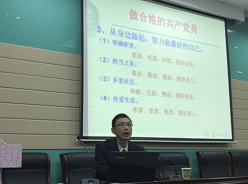 为深入学习贯彻党的十八届六中全会精神,全面理解从严治党的战略高度,教育广大党员增强政治意识、大局意识、核心意识、看齐意识,自觉严守党规党纪,做合格的共产党员。11月23日下午,我院特别邀请了校马克思主义学院党委书记张才君教授作了《党章与管党治党新的里程碑》学习辅导。学院全体党员、学生党支部书记、研究生辅导员出席活动,学习活动由学院党委副书记李伟文主持。