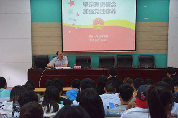 为深入贯彻党的十八大、十八届三中四中五中六中全会精神和习近平总书记在全国高校思想政治工作会议上的重要讲话精神,教育引导学生党员进一步增强“四个意识”和组织纪律观念,做到政治合格、执行纪律合格、品德合格、发挥作用合格。2017年5月24日下午,我院党委书记邓国林在文辉220教室为学院全体党员同学上党课,题目为《坚定理想信念 加强党性修养》。