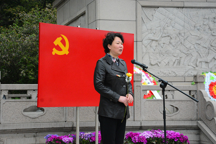 伫立在纪念碑前,国歌响起,同学们气宇轩昂,满怀激情,将自己内心的感恩与敬意化作歌声倾涌而出。在全体师生怀着敬畏与感恩之心进行了三鞠躬之后,体育学院党委副书记李伟文进行了党旗下的讲话,提出:清明扫墓是一种革命情感教育,追思先辈,缅怀先烈,每位师生思想都受到洗礼,心灵都产生触动,我们要使红色基因渗进血液、浸入心扉,沿着革命前辈的足迹继续前行;清明扫墓也是一次党性教育,希望每位同学深刻领会中国共产党是中国人民和中华民族先锋队的性质,学习党的指导思想和行动指南,加强党的组织和纪律,坚用党员标准严格要求自己,做理论学习的模范,党性党风的模范,学习创新的模范,弘扬正气的模范,文明修身的模范。