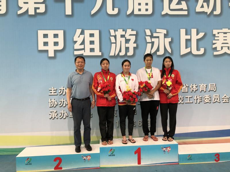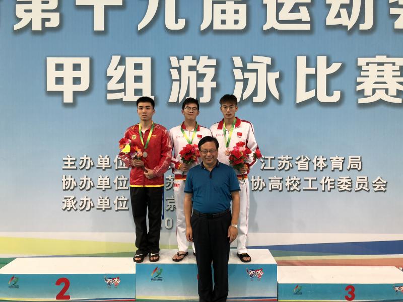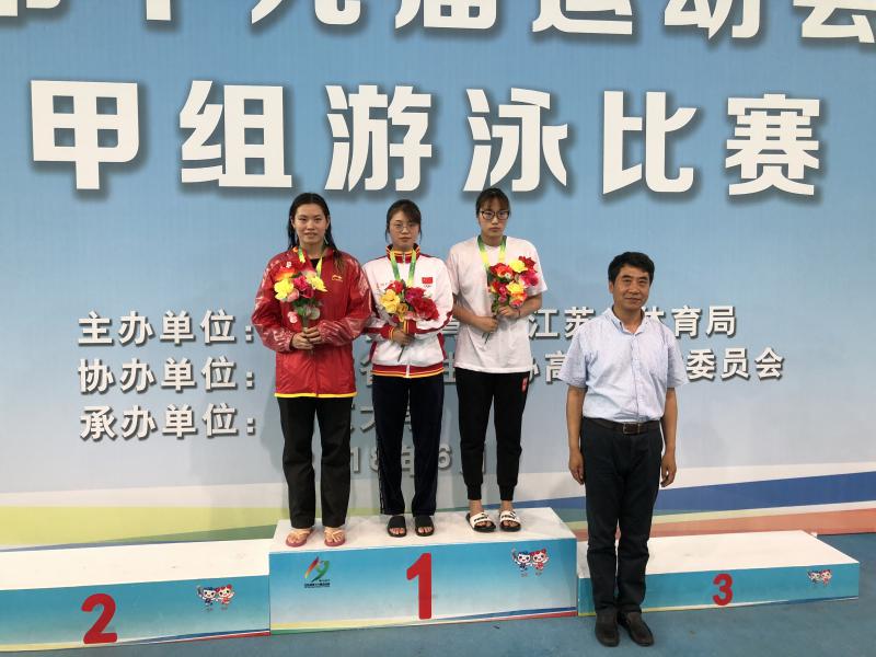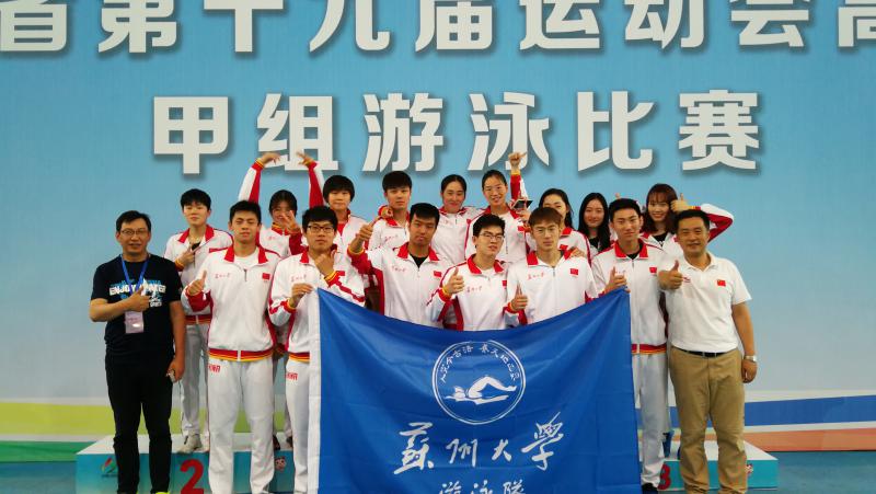2018年6月12日下午,江苏省第十九届运动会高校部游泳比赛在南京大学仙林校区落下帷幕。本次比赛共有来自25所高校的近300名运动员参赛。我校游泳队在领队徐建荣老师和教练员陈钢老师的带领下,共15名(男子8人、女子7人)运动员报名参赛,经过3天的激烈角逐,斩获19金16银8铜,荣登金牌榜榜首,金牌数刷新了省运会历史新高。同时,我校游泳队以379分,位列团体总分第二名,其中,女子团体总分第一名,男子团体总分第三名。徐茜彧、崔宁和居政三位同学荣获“体育道德风尚奖运动员”称号。
