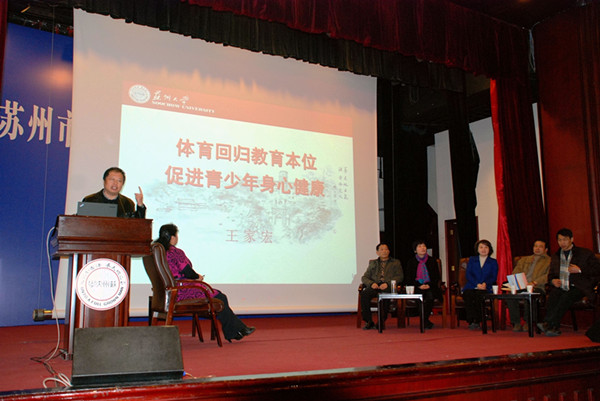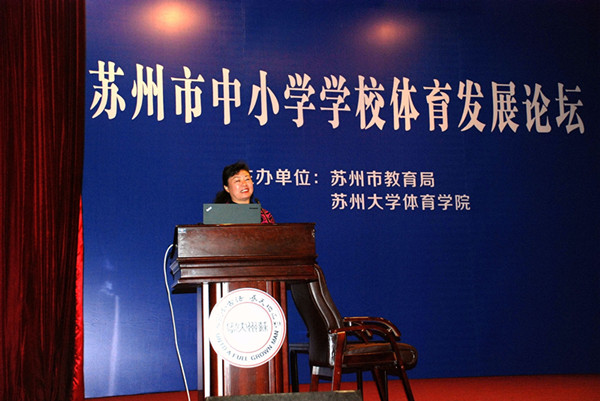 论坛的开幕式由市教育局体卫艺处江莉处长主持,苏州大学校长助理王家宏教授代表苏州大学致了欢迎辞并作了“体育回归教育本位,促进青少年健康”的专题报告。苏州市教育局副局长华意刚在开幕式上讲话,强调在教育现代化推进过程中,要高度重视体卫艺工作,将之融入到基础教育的整体质量观中,全面提升学生身心健康。论坛采用了形式活泼的访谈方式。由江苏省中小学教研室孟文砚担任嘉宾主持,访谈嘉宾邀请了苏州大学体育学院院长陆阿明,苏州市教育局体卫艺教处项目办主任、特级教师李勇民,苏州工业园区星湾学校校长曲虹,苏州市教科院初教所所长、体育教研员高福海,体育教授级高级教师、苏州草桥中学校党委副书记、副校长蒋玉红。专家们围绕“学校体育发展机遇及面临的挑战与应对”为主题,展开了热烈的讨论。孟文砚站在江苏学校体育的高度结合中外中小学体育开展情况和目前学校体育面临的挑战畅谈了自己的观点;曲虹校长向大家描绘了她心目中理想的学校体育及优秀体育教师蓝图,也把星湾学校的做法作了介绍;李勇民围绕苏州中小学体育现状进行了剖析,也向大家介绍了教育局在中小学体育上进行的改革举措;蒋玉红副书记就体育如何完善学生人格及如何提高体育课堂有效性与大家作了分享;高福海对体育教师队伍的培养以及高校如何更好地与中小学接轨谈了自己的观点;陆阿明院长就目前苏州大学体育学院在体育专业人才培养的新的思路和举措及苏大如何更好服务苏州教育谈了自己的看法。