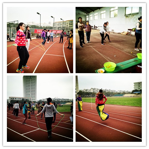 本次运动会共设袋鼠跳跳、齐头并进、请君入瓮、踢毽子、跳绳五个趣味项目,每个项目都要求集体参加、团队合作,四人为一组。本着“重在参与,享受运动”的宗旨,我院女教工积极参与各项趣味运动,取得了较好的成绩。运动会全程充满了乐趣与欢笑,操场上到处洋溢着快乐的气氛,为节日平添了一道靓丽的风景线。