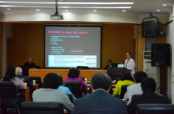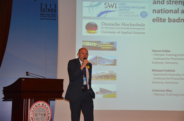 开幕式结束后,国家体育总局体育科学研究所教授王清、德国奥林匹克训练中心生物力学与康复实验室主任Hanno Felder先生分别作了《对准备参加重要国际比赛的中国乒乓球精英运动员科学支持》和《国际和国内羽毛球精英球员的肌肉强度值和力量比》的大会主题报告。