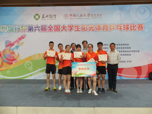 2015年5月30-31日由中国大学生体育协会主办,中国人民大学苏州校区承办,中国大学生体育协会乒乓球分会、江苏省教育厅协办的第六届全国大学生阳光体育乒乓球比赛在高教区独墅湖体育馆举行。这次比赛共有上海交通大学、浙江大学、南京大学、华东理工大学、中国人民大学、西安交通大学等32所高校约260多名运动员和教练员参加了比赛,这也是开赛至今参赛高校最多的一届比赛。