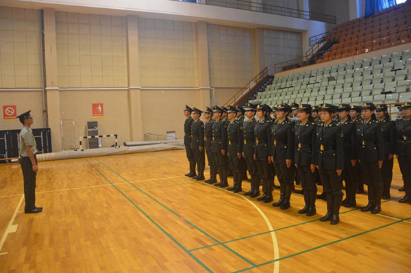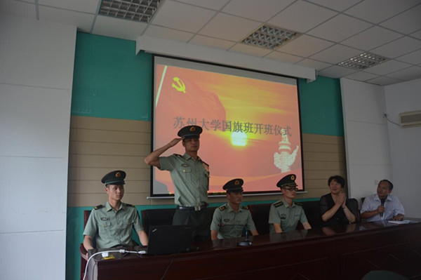 为进一步加强大学生国防思想教育,迎接省军区和省教育厅联合举办的江苏省普通高校国旗班比武,2015年7月8日下午,校国旗班开班仪式在文辉楼220隆重举行。苏州大学人武部部长邓国林、人武部副处级调研员张镇华、体育学院党委副书记李伟文及驻苏73049部队排长潘岳等四位官兵、体育学院40名身着整齐的绿军装国旗班成员参加了此次大会。