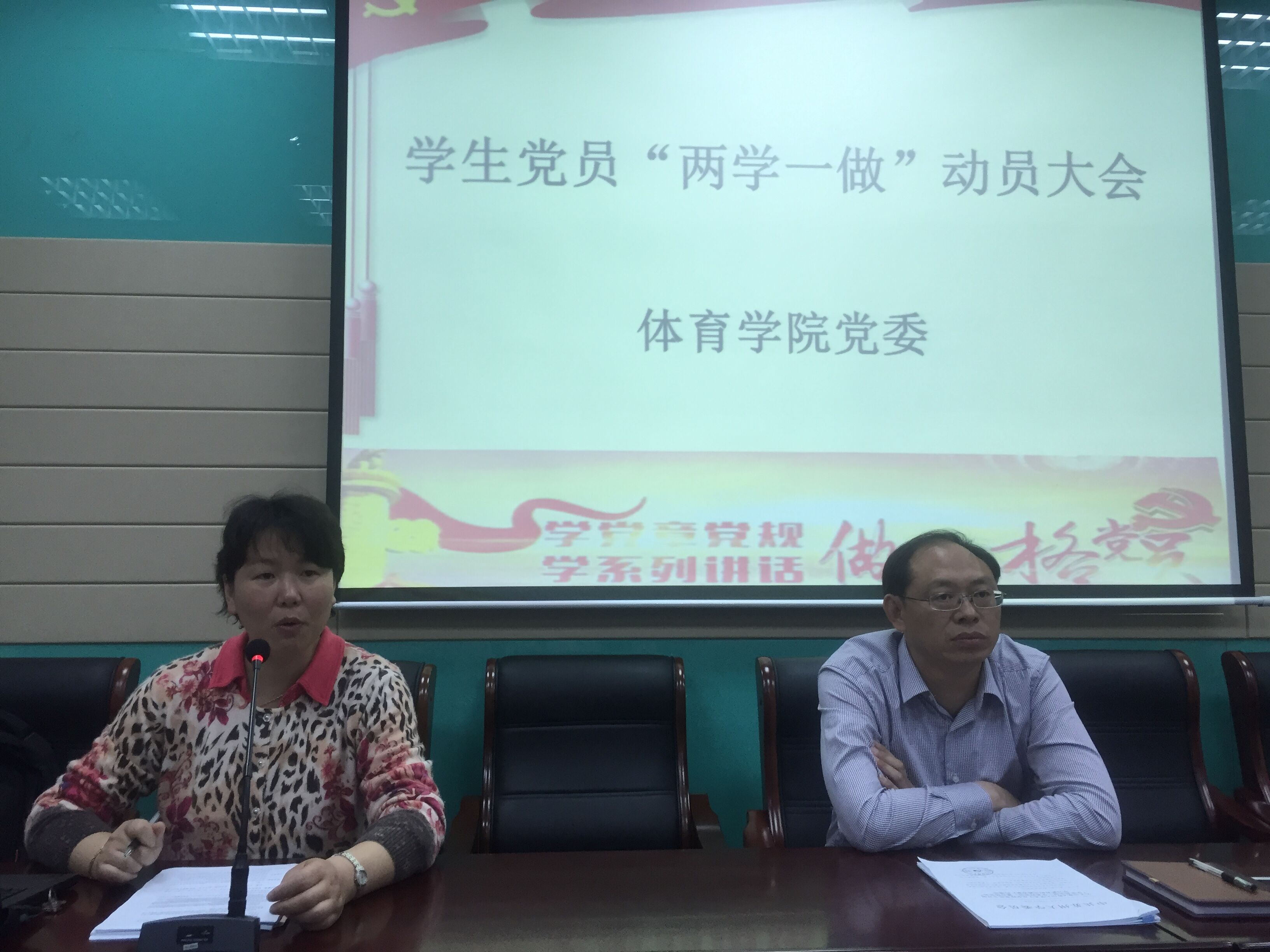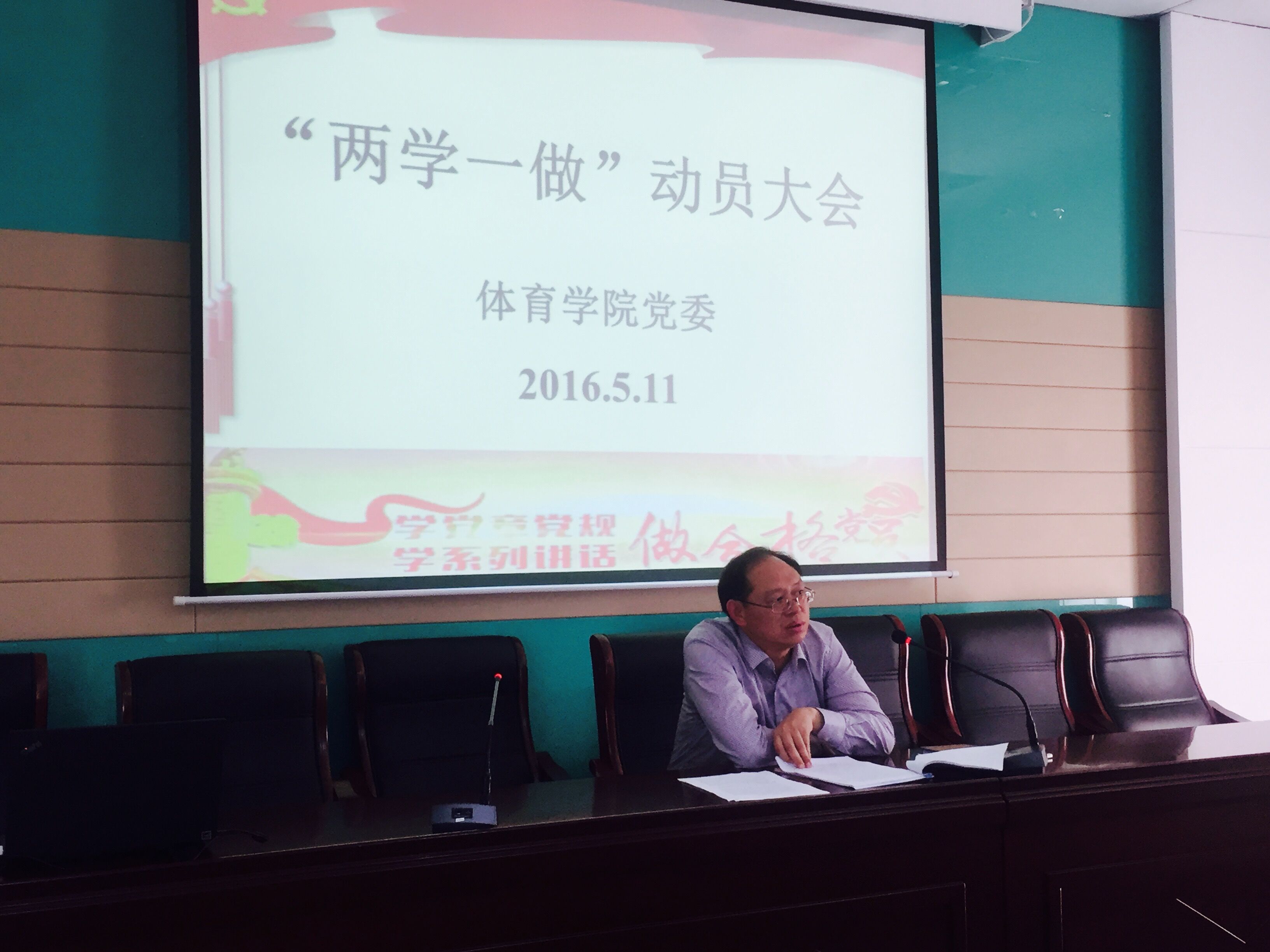 体育学院党委根据中央《关于在全体党员中开展“学党章党规、学系列讲话,做合格党员”学习教育方案》和省委、市委、省教育工委《实施方案》精神以及苏州大学党委有关要求,结合实际情况,开展“两学一做”系列教育活动。5月11日,院党委分别召开教工党员和学生党员二个批次的“两学一做”学习教育动员大会,标志着 “两学一做”学习教育实践活动正式启动。