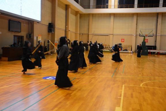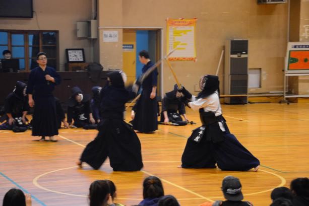 基本技术展示结束后,由6名学员组成两队,展示剑道比赛。比赛双方都十分认真,比赛也是激烈异常,周旋,出招,防守,躲避,两人的一招一式都牵着同学们的心,得分时刻同学们都情不自禁的鼓掌。比赛结束,虽然因时间关系最终未能分出胜负,令人略有些遗憾,同时同学们也为这精彩的比赛叫好。