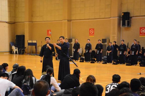 为使同学们全面了解剑道,杨敢峰老师特别邀请了杨式剑道馆的20名学员参加剑道的基本技术和比赛方法的展示环节。20名学员成一排跪坐,分别向观众和老师行礼,然后穿戴装备,在场地中央分两排面对面站立,在老师的指令下开始演示多套剑道技术,一时间场馆内气势震天,竹剑与竹剑、竹剑与护具之间猛烈撞击,夹杂着学员的呼喝声,带动了全场的气氛。随后,香田教授就学员的表现进行了点评,为表达清楚,还与一位学员单独切磋,同时进行指导。