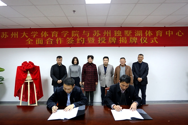 12月1日,我院与苏州独墅湖科教发展有限公司体育中心分公司在中心举行实习实践基地签约揭牌仪式。苏州独墅湖科教发展有限公司董事长兼总经理姚建新、总经理助理戚瑶亮、独墅湖体育中心主任钱宁丰、体育学院院长陆阿明、院党委副书记兼副院长李伟文、体育系主任王平,出席此次实习实践基地签约揭牌仪式。