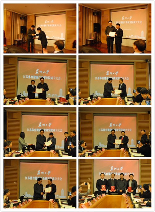 为深入贯彻国务院46号文件和“健康中国2030”规划纲要的精神,“苏州大学江苏体育健康产业研究院(以下简称‘研究院’)成立仪式”于3月17日在红楼会议室隆重举行,研究院的建立是江苏省体育局和苏州大学共同贯彻国务院纲要文件精神的重要举措,是共同合作领域的进一步拓展。苏州大学党委书记王卓君、江苏省体育局局长陈刚、江苏省体育局副局长王志光、苏州市体育局局长周志芳、中国康复研究中心康复信息研究所所长邱卓英、江苏体育产业协同创新中心秘书长王家宏、体育学院党委书记邓国林及校内职能部门领导等共同出席本次大会,江苏金陵体育器材股份有限公司等合作企业的代表参加会议,会议由苏州大学副校长袁银男主持。
