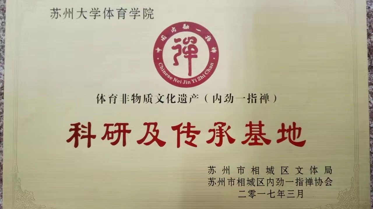 4月8日上午,我院与相城区文体局、“内劲一指禅”协会共同举行苏州大学体育学院“体育非物质文化遗产(内劲一指禅)科研与传承基地”揭牌仪式。我院相关领导和教师,相城区文化体育局领导,内劲一指禅第十九代传人阙巧生等共同参加揭牌仪式。