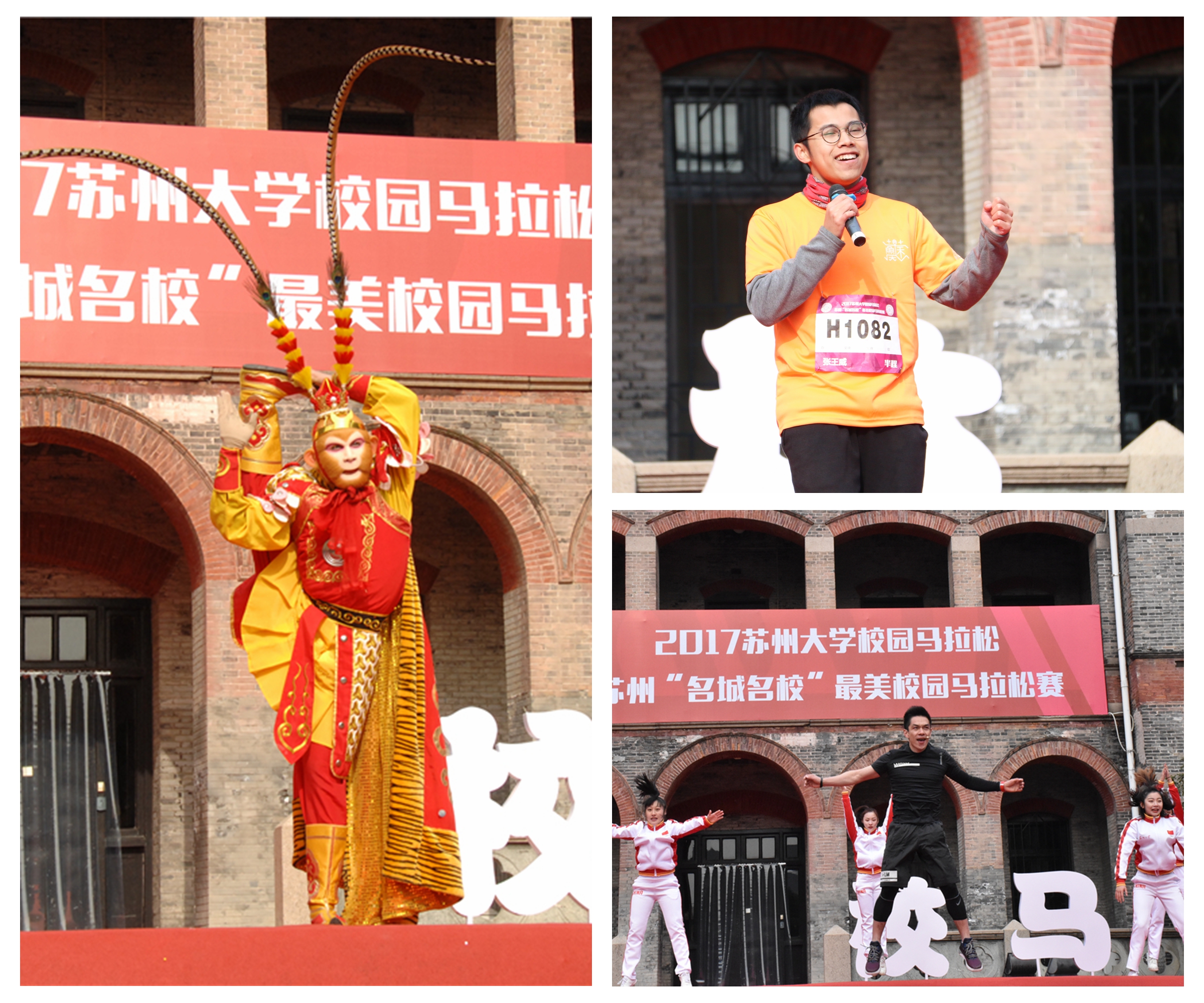 比赛过程中穿插了许多精彩表演和现场互动节目,设置了签到墙、手印墙、涂鸦大赛、终点线创意合影等纪念活动,还有穿着玩偶服装的志愿者在现场分发印有苏州大学校徽样式的气球,气氛十分热烈。“我是陪我在苏州大学读研二的女儿来的,校马让我感觉很开心!很舒服!”在集体热身活动中一直特别认真做操的51岁贺阿姨说。比赛中,有不少家庭“全家总动员”,报名参加了形影相随项目。“我从小就喜欢体育,也希望让老婆孩子一起感受这种浓厚的文化氛围。”一位教师表示。