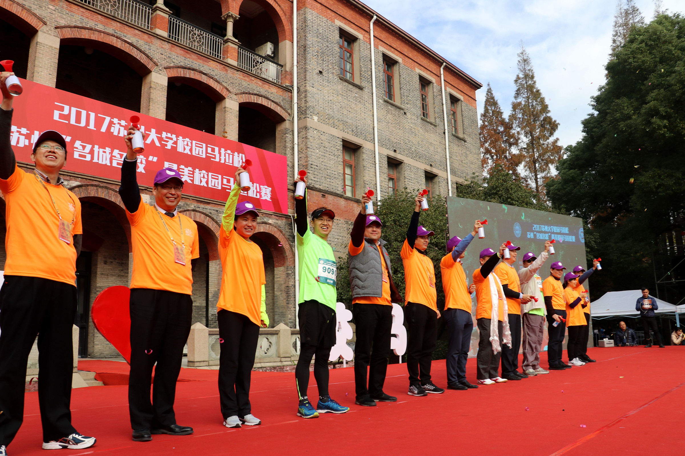 教育部体育卫生与艺术教育司体育卫生处副处长许弘,我校党委常委、纪委书记芮国强,党委常委、总会计师周高,江苏省体育局经济处处长潘时华,江苏省教育厅体育卫生与艺术处主任古恺,江苏省体育局社体中心主任刘陶,江苏省大学生体育协会主席王家宏,台湾东吴大学原校长刘源俊,我校校友、苏州市体育局局长周志芳,我校校友、两届奥运会冠军、苏州市体育局副局长陈艳青,我校校友、马拉松奥运选手、世界冠军、江苏省体育局训练中心中长跑队领队周春秀,我校校友、同程网络科技股份有限公司董事长吴志祥等领导和嘉宾出席了起跑仪式。仪式由周高主持。
