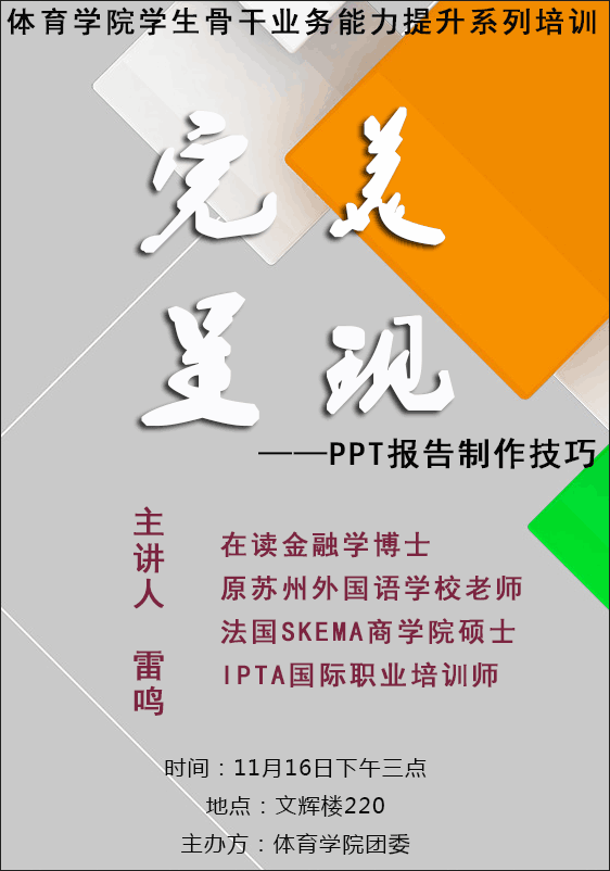 我院将举办学生骨干业务能力提升系列培训《完美呈现——PPT报告制作技巧》