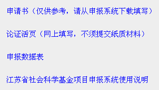 今年省社科规划项目继续实行网上申报。申报者通过“省社科基金项目网上申报系统”进行网上申报(网址:http://jspopss.jschina.com.cn)。申报系统填写方法详见“江苏省社会科学基金项目申报系统使用说明”。申报者提交成功后,须动态跟踪材料审核情况,确认审核是否通过。为了保证网上申报材料和纸质申请书的一致性,请申报者在完成网上申报后操作打印《申请书》(一律用A3纸双面印制,中缝装订),《申请书》经所在单位审查盖章后,统一报送省社科规划办公室。