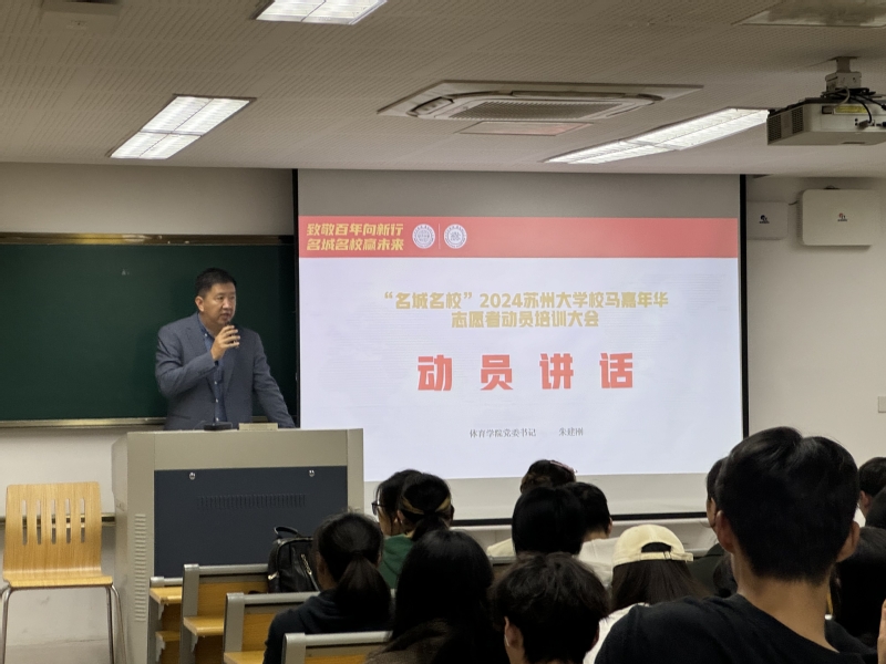 为提高苏州大学校马嘉年华志愿者服务质量与水平,展现苏大学子积极向上的精神风貌和积极奉献的志愿热情,11月13日下午,“名城名校”2024苏州大学校马嘉年华志愿者专题培训会在苏州大学天赐庄校区博远楼201顺利召开。体育学院党委书记朱建刚,体育学院党委副书记、副院长丁海峰,体育学院团委书记商仪出席。本次校马志愿者共120余名同学参加培训会。