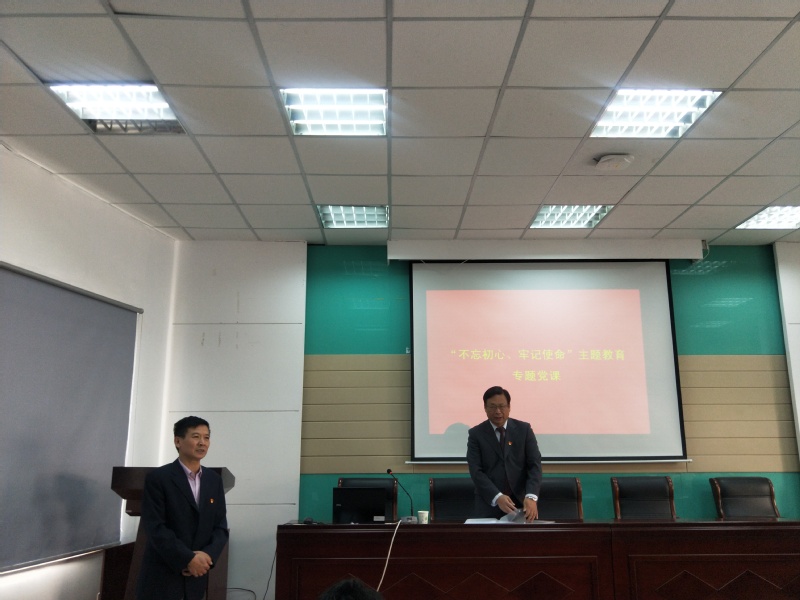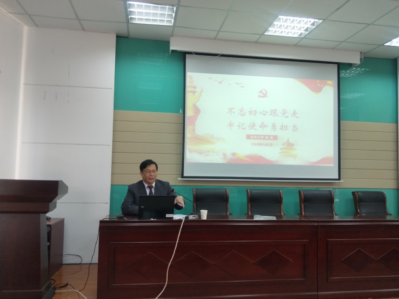 校党委常委、总会计师周高于2019年11月5日在文辉220,为学院党政领导班子、党委委员、党支部书记及师生党员代表讲题为“不忘初心跟党走,牢记使命勇担当”的专题党课。专题党课由院党委书记杨清主持。