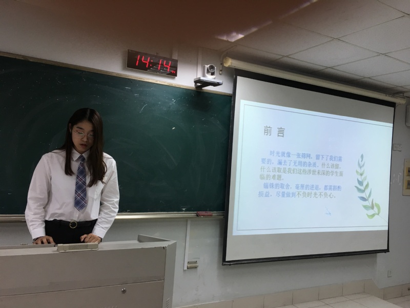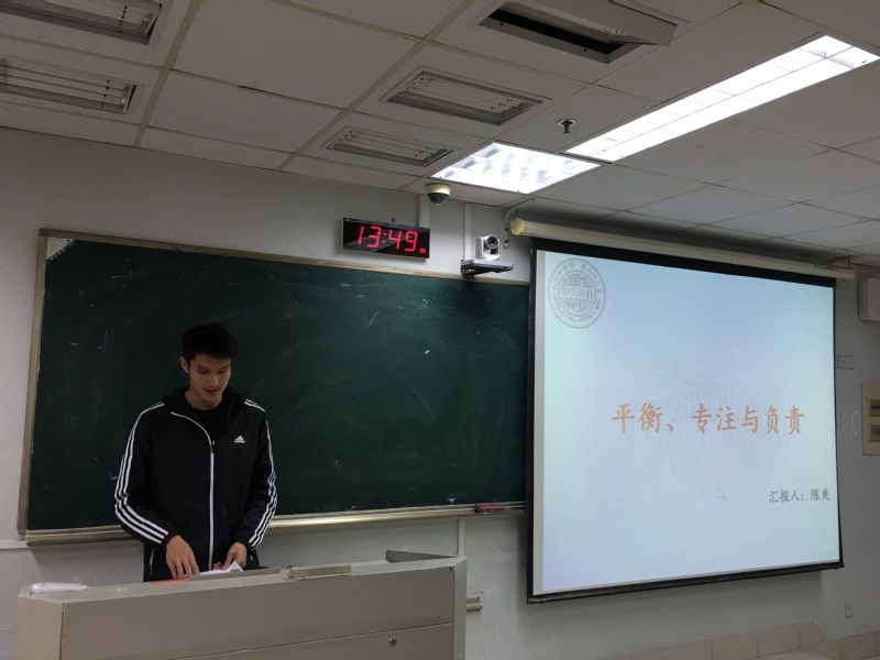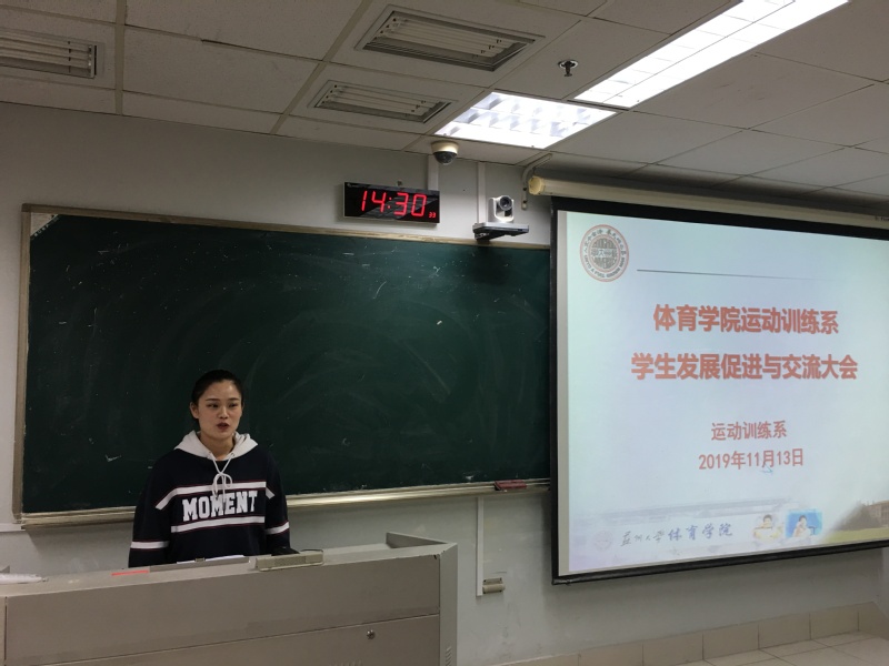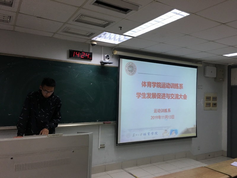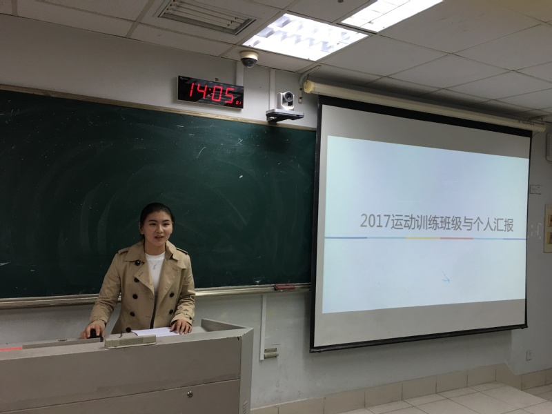 紧接着,各年级学生代表进行经验分享,相互交流学习。研三的陈爽同学围绕平衡、专注、负责三要点,结合其足球专项的训练历程和大学四年的成长经历娓娓道来,给学弟学妹们提出了不少建议,言语里流露出对学弟学妹的殷切希望;17运训的徐思雨同学,从学习、生活、训练、工作四个方面进行了分享,利用丰富多彩的图片展现了她两年多的大学生活;18运训刘雨欣同学视角新颖,从取与舍的角度出发,通过个人在取舍之路上的探索和发现与大家分享了她的心得,最终表达了自己对取舍的收获和期待;19运训的龚佳奇同学虽然入学时间只有短暂的两个月,但他也结合自身在训练和学习方面的经验,对将来提出了目标。随后,19运训的班主