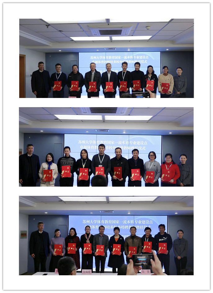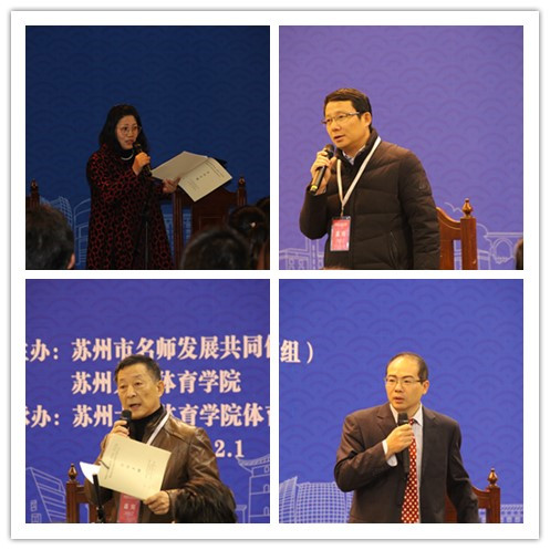 报告会结束后,举行了“苏州大学卓越体育教师培养校外特聘教师”聘任仪式。苏州大学师范学院副院长、教务部教学运行处副处长陆丽和学院党委朱建刚为受聘教师颁发了聘书。苏州工业园区体育教研员章扬安老师代表受聘老师做了发言。随后蒋玉红校长、苏州市教育科学研究院体育教研员高福海老师分别就苏州市名师发展共同体(体育组)近年来的发展情况和未来愿景和卓越体育教师应具备的素质与能力做了精彩发言。