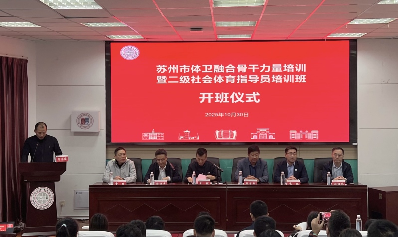 2025年10月30日-10月31日,我院承办了“苏州市体卫融合骨干力量培训暨二级社会体育指导员培训班”。10月30日上午,开班仪式在文辉楼220举行,苏州市运动促进健康中心试点单位以及基层社区卫生服务中心共67名学员参加培训。苏州大学体育学院党委书记朱建刚,苏州市体育局副局长李镔,苏州市卫健委副主任陆治平,上海体育大学竞技运动学院副院长袁鹏,苏州市体育局四级调研员曹煦,苏州市卫健委基层处处长刘俊宾出席开班仪式,仪式由苏州市体育局群体处处长李志国主持。
