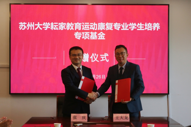 随后,举行“苏州大学耘家教育运动康复专业学生培养专项基金”的签约仪式。张庆代表苏州大学接受了健达育人(苏州)教育科技有限公司的无偿捐赠。