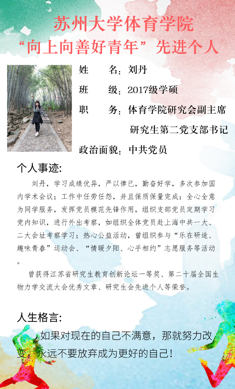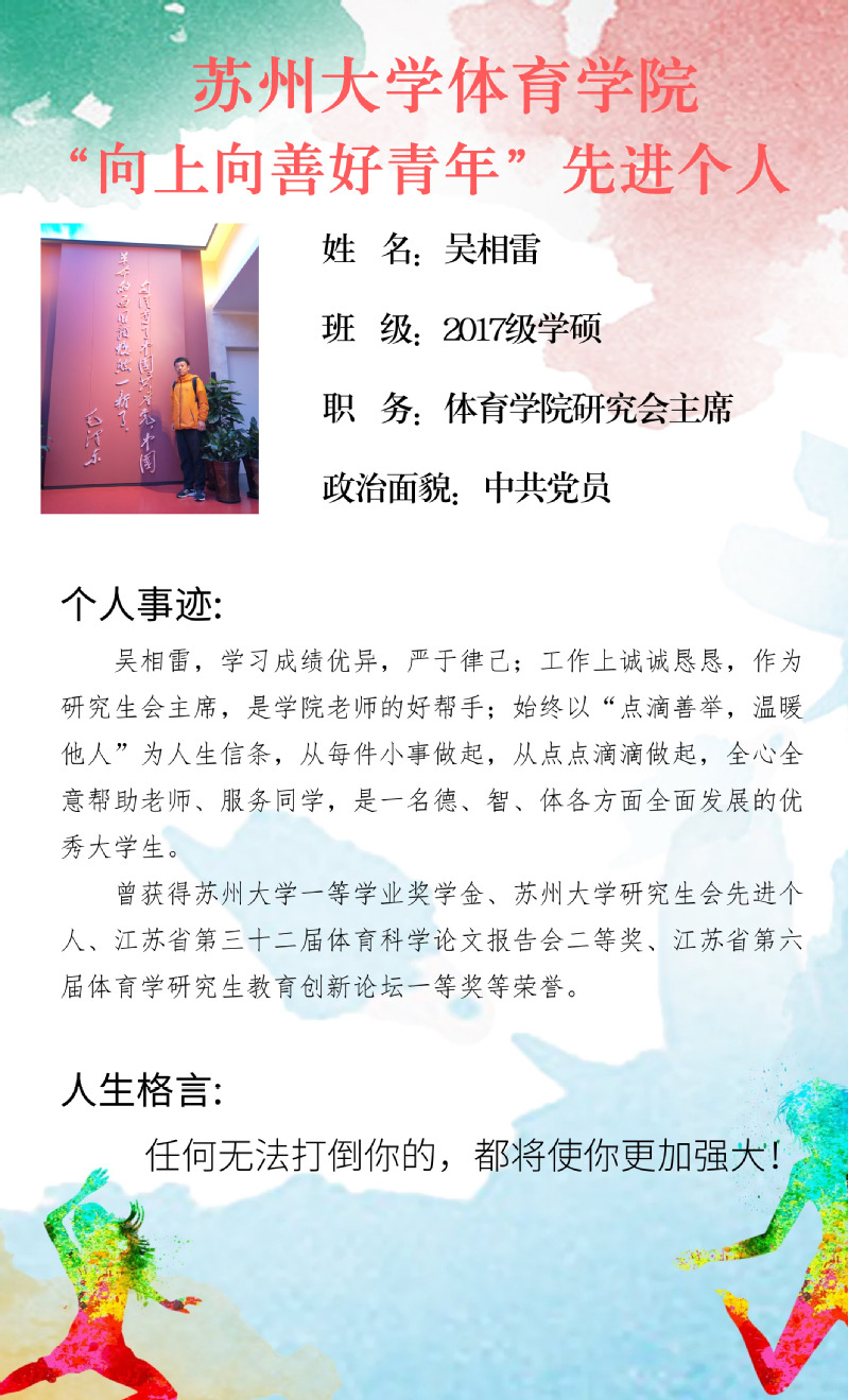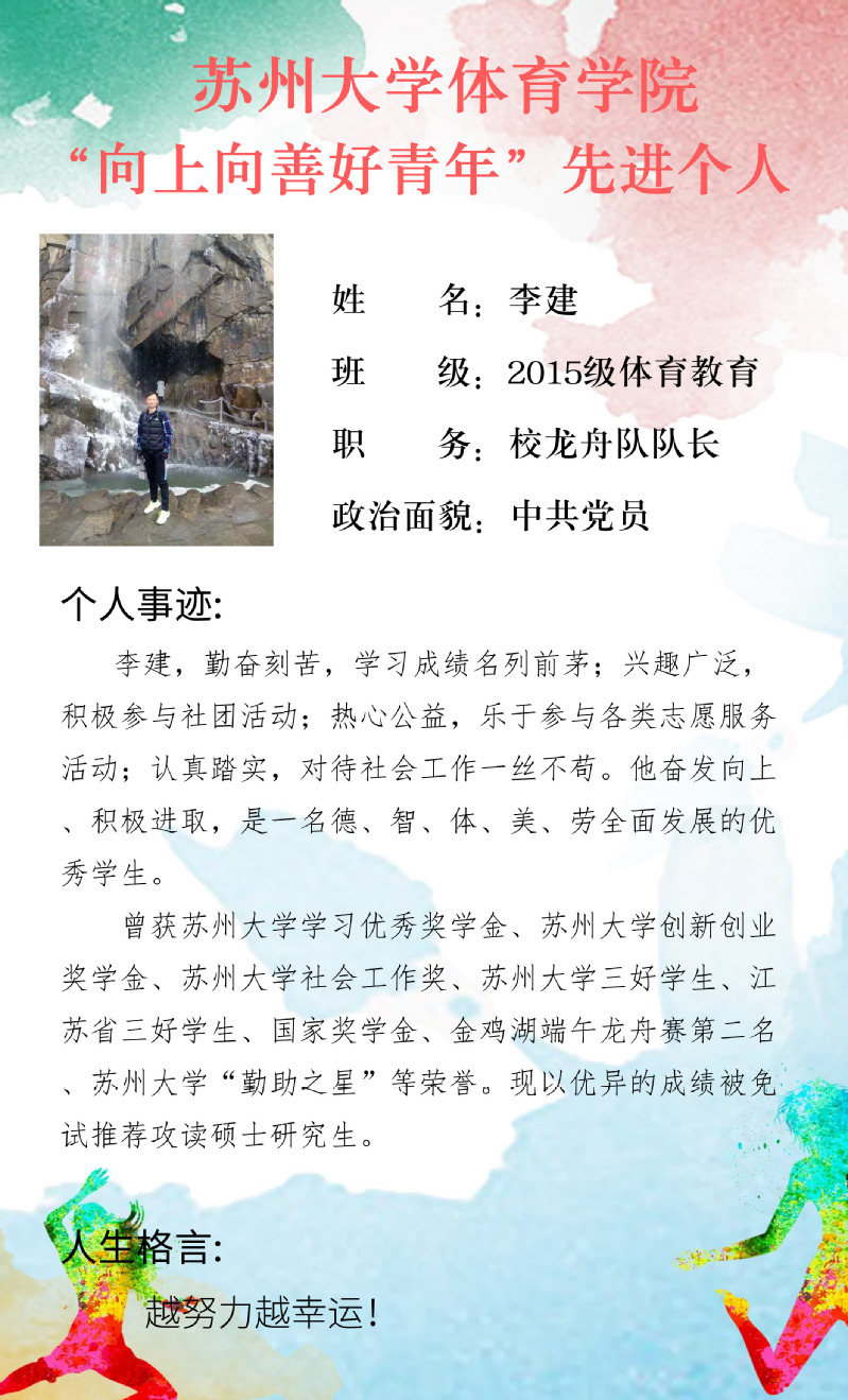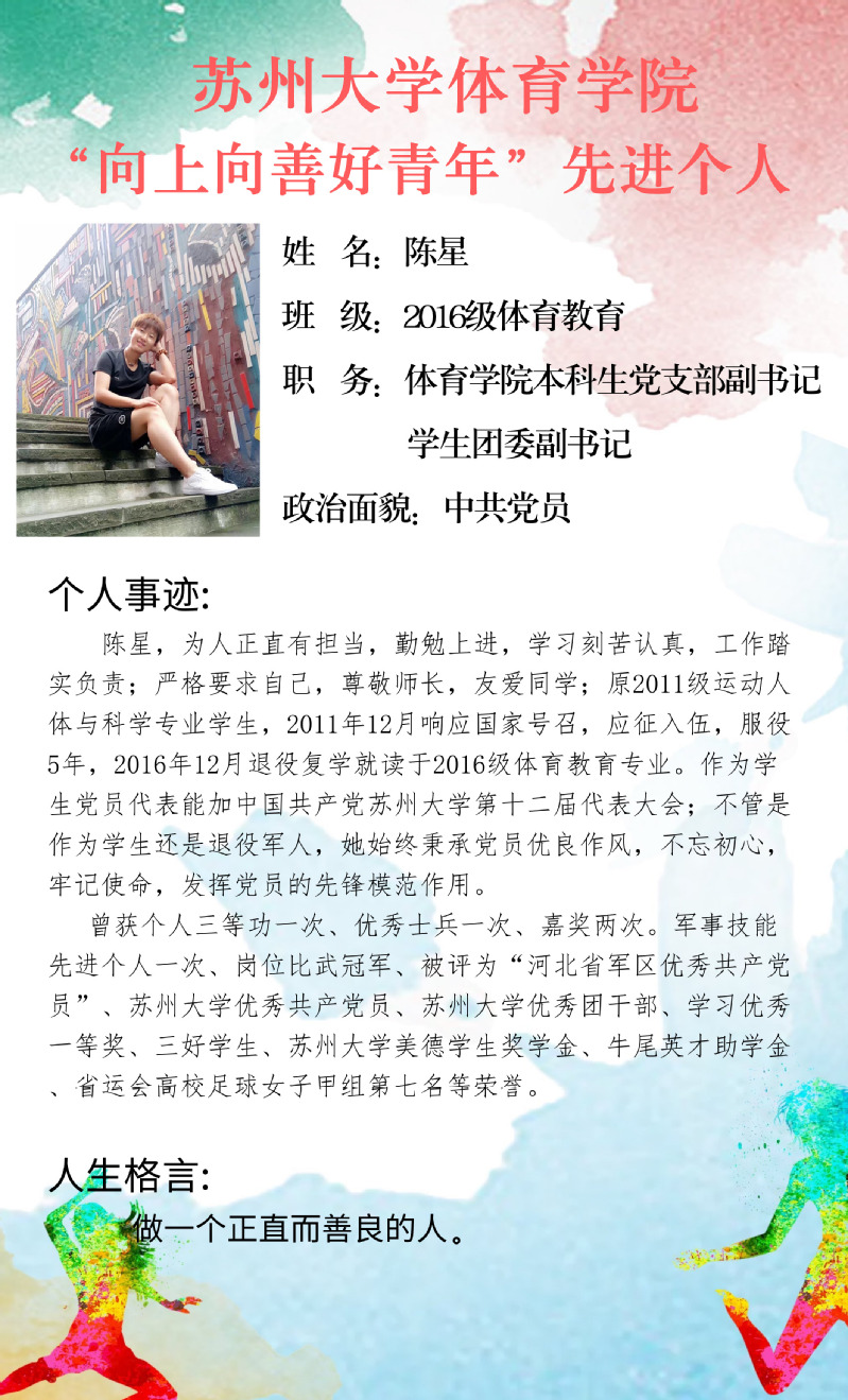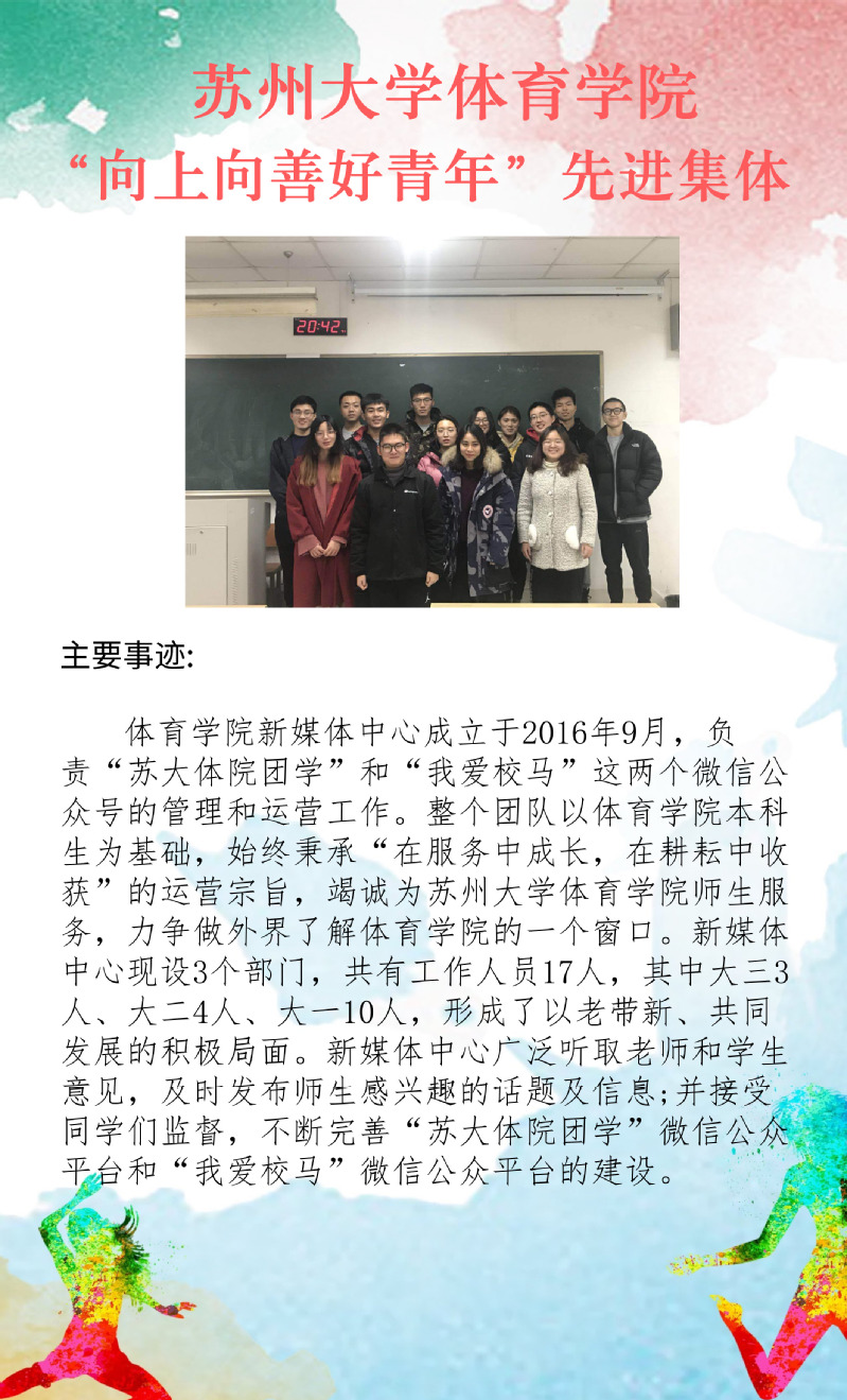 为深入贯彻习近平总书记在全国高校思想政治工作会议上的重要讲话精神,坚持不懈培育和弘扬社会主义核心价值观,引导广大师生做社会主义核心价值观的坚定信仰者、积极传播者、模范践行者。我院将组织开展评选2018年体育学院“向上向善好青年”活动,经学生自主申报、党委考核,评选出陈星、嵇恺然、李建、刘丹、吴相雷、于明礼6名同学为“向上向善好青年”先进个人和体育学院新媒体中心为“向上向善好青年”先进集体,现将材料展示如下: