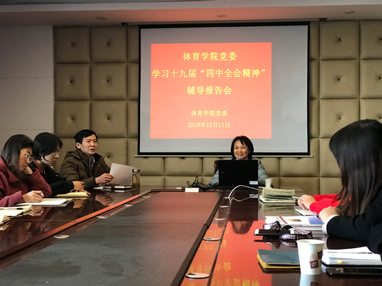 为进一步学习贯彻党的十九届四中全会精神,2019年12月11日下午,我院党委特邀校纪委办公室陶培之主任、校党委组织部组织科吴常歌老师,在文辉楼217举办学习十九届“四中全会精神”辅导报告会。学院党委书记杨清、党委副书记丁海峰、各党支部书记及支委等参加学习。报告会由杨清主持。