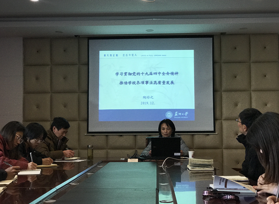 首先,陶培之主任以“学习贯彻党的十九届四中全会精神 推动学校各项事业高质量发展”为主题,从“深刻认识党的十九届四中全会的重大意义”、“坚持和完善党和国家监督体系部署要求”以及“纪检督查机关全面落实四中全会的决策部署”三个方面进行阐述。陶主任结合我院的实际情况,建议我院党委把学习贯彻全会精神和做好当前工作紧密结合起来,扎实抓好年终岁尾各项工作的落实,努力以完善纪检监督的实际行动检验学习贯彻全会精神的实际成效。