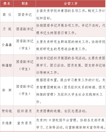 共青团苏州大学体育学院委员会是学院先进青年的群众性组织,党的助手和后备军。主要职能包括团结教育青年学生、执行党的青年工作方针、创新推进青年工作。