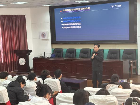 张辉教授结合自身科学研究经历,以“竞技体育比赛数据分析”为题展开了层层的深入介绍。为了让学生更加深入地了解运动表现分析领域,张教授以比赛数据分析的特点为切入点,详细向大家介绍了运动表现分析的全过程,向全体研究生展示了如何对运动表现进行科学研究,从比赛数据采集以及模型的构建到数据处理与分析,张教授循循善诱,不断扩展学生思维。最后,张教授阐释了运动表现分析领域的前沿进展,总结目前比赛数据分析面临的挑战,并向同学们提出未来科研工作的建议。张教授的讲座干货满满,开拓了学生的研究视野,在场同学们纷纷表示收获颇丰。