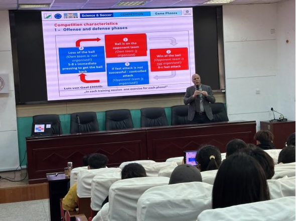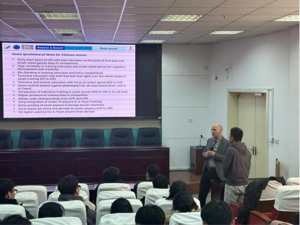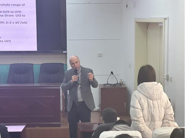 Andreas Hohmann教授以“Competition,Performance and Training for long-term development of elite soccer players”为主题,以精英足球运动员培养模式为主要路线,从竞赛特点、团队表现、训练策略三个维度展开介绍。讲座伊始,Andreas Hohmann教授介绍了通用训练科学模型,详细阐述了训练、竞赛、表现三者之间的关系。随后,进一步分析了精英足球运动员培养途径,涉及身体素质、人才选拔、测试规范等方面知识,深入浅出将学术观点与理论知识相结合。最后,Andreas Hohmann教授在深入剖析中外足球训练体系的基础上,提出自已对中国足球的初步见解。他对于精英足球训练模式的独特见解,引发在场学生共鸣。