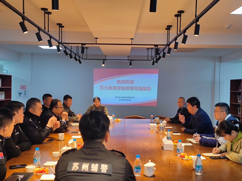 巡特警支队热情接待了来访团队一行,带领来访团队进行实地参观考察,包括装备室、党建工作室、训练场、科医保障中心等,并实地观看了巡特警们的各科目训练。参观结束后,汪洋支队长详细介绍了苏州巡特警支队的发展历程、人才需求及未来规划等,表达了对体育专业技能性人才和运动康复人才的特殊需求。学院党委书记朱建刚向走访单位介绍了我院学科建设、专业发展、人才培养及社会服务等情况,尤其对武术与民族传统体育专业和运动康复专业与巡特警支队的人才需求适配性做了详细阐述,希望以此次调研访问为契机,协同开展实践育人、科研创新、人才培养等,实现双方互利共赢。双方就人才培养、资源共享、实践教学等方面进行了深入交流,并达成了多项合作意向。