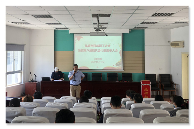 2020年5月13日下午13:30,体育学院校第八届教代会、第十四届工代会代表选举大会在文辉楼220举行,会议由工会主席奚启超老师主持。
