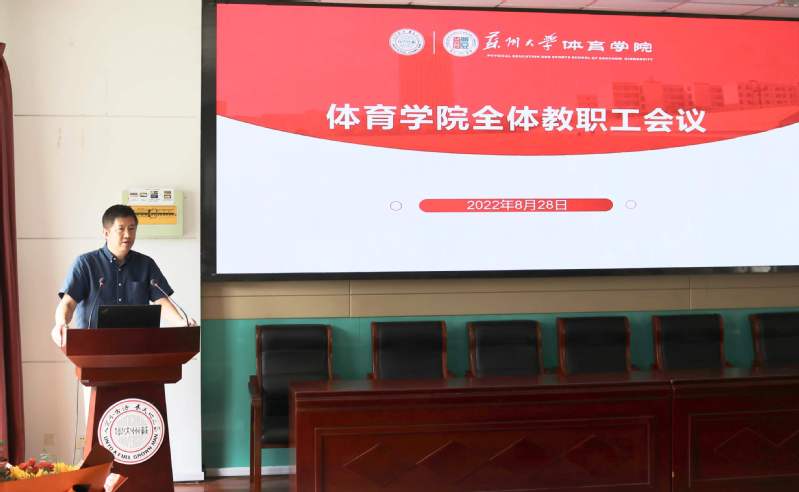 2022年8月28日13:30,体育学院全体教职工会议在文辉楼220举行,会议由党委书记朱建刚主持。