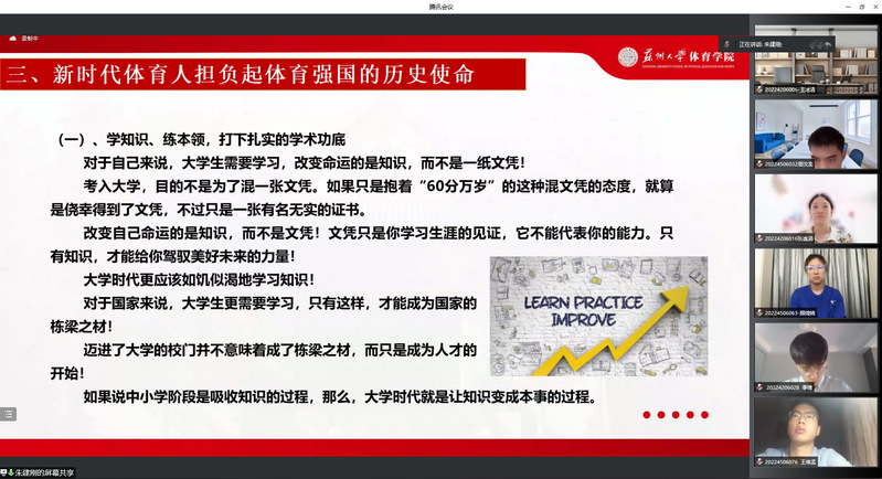 9月7日上午,院党委书记朱建刚以“新时代体育人的责任和使命”为题,在线为我院2022级研究生讲授“书记第一课”,130余名研究生新生线上聆听授课,讲座由研究生辅导员胡梦霞主持。