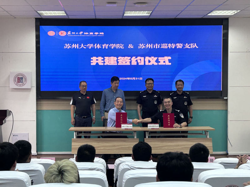 签约仪式中,苏州市公安局巡特警支队副队长张国强与苏州大学体育学院副院长张宗豪作为代表,在支队长汪洋、政委龚健、院党委书记朱建刚、院长陶玉流的共同见证下,正式签署了合作共建协议。