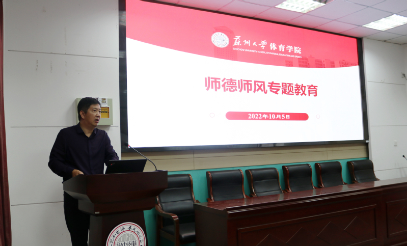 院党委书记朱建刚就加强体育学院师德师风建设进行了专题教育。他强调,作为高校教师一要始终坚持立德树人根本任务,以生为本、关爱学生;二要加强教材管理、课堂管理,精于教学,严谨治学;三要不断加强自身建设,以德立身、以身示教,恪守师德规范;四要坚持学术诚信,勤于进取,严守纪律底线;五要珍视高校教师身份,不在微信、QQ等自媒体平台发表与身份不符的言论,发生与身份不符行为。会议最后,朱建刚就其他高校教师师德失范行为的典型案例进行了警示通报,他希望全院教师在师德师风建设中争当模范,积极发挥表率作用,以实际行动共同营造风清气正的育人环境。