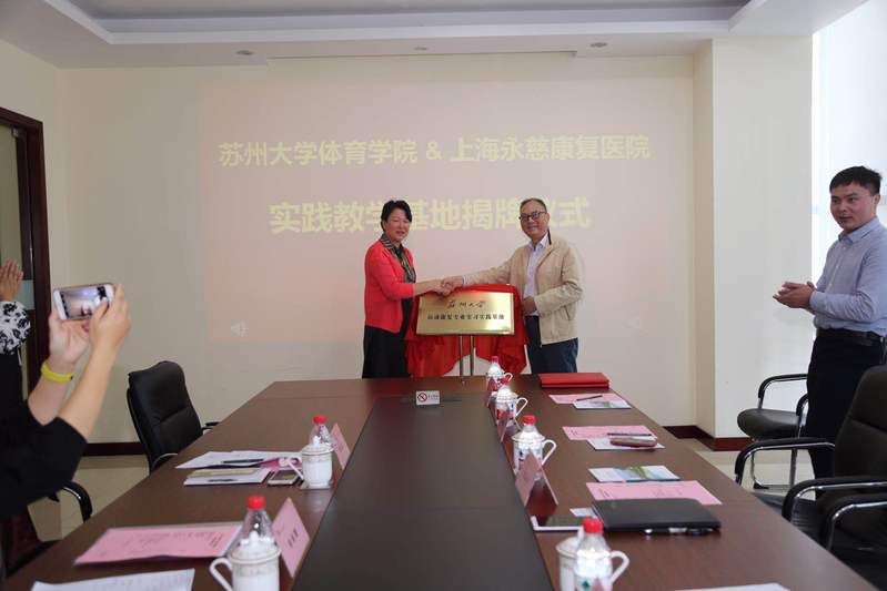 2018年10月12日上午,苏州大学体育学院与上海永慈康复医院共建康复临床实习基地签约仪式和实践教学基地授牌仪式在上海永慈康复医院举行。上海永慈康复医院院长沈旭东,行政副院长何玉山,人力资源总监陈世萍,医务中心主任孙晶,康复中心副主任聂蘋,康复中心副主任沈建忠,苏州大学体育学院党委副书记兼副院长李伟文,运动康复系主任张秋霞出席仪式。