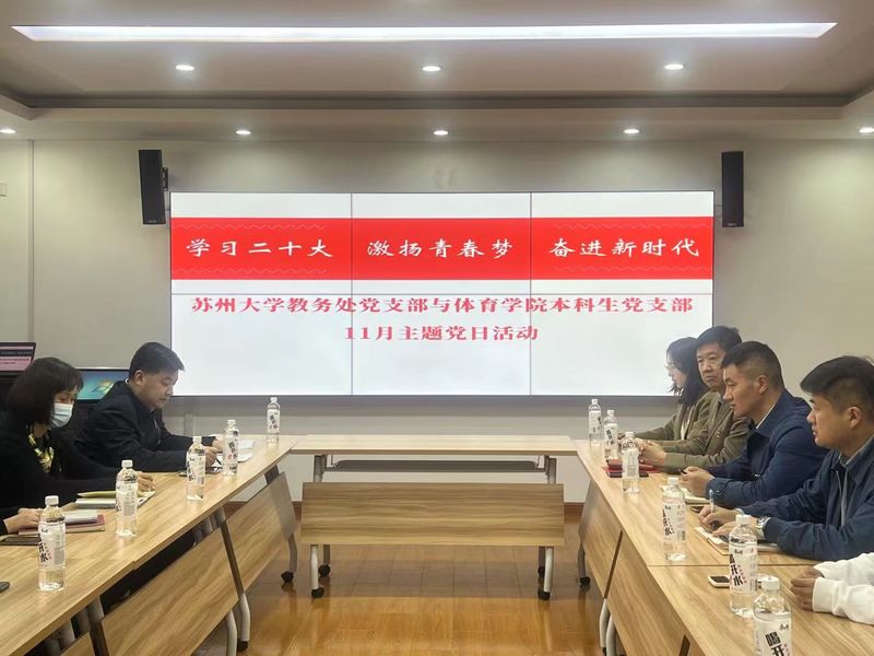 11月16日,体育学院本科生党支部与苏州大学教务处党支部共同开展“学习二十大 激扬青春梦 奋进新时代”主题党日活动。苏州大学党委常委、副校长姚建林,体育学院党委书记朱建刚以普通党员身份与30余名党员师生共同参加活动。活动由体育学院本科生党支部书记商仪主持,活动分为激信念展风采、群策力向未来,学报告悟成就三个环节。